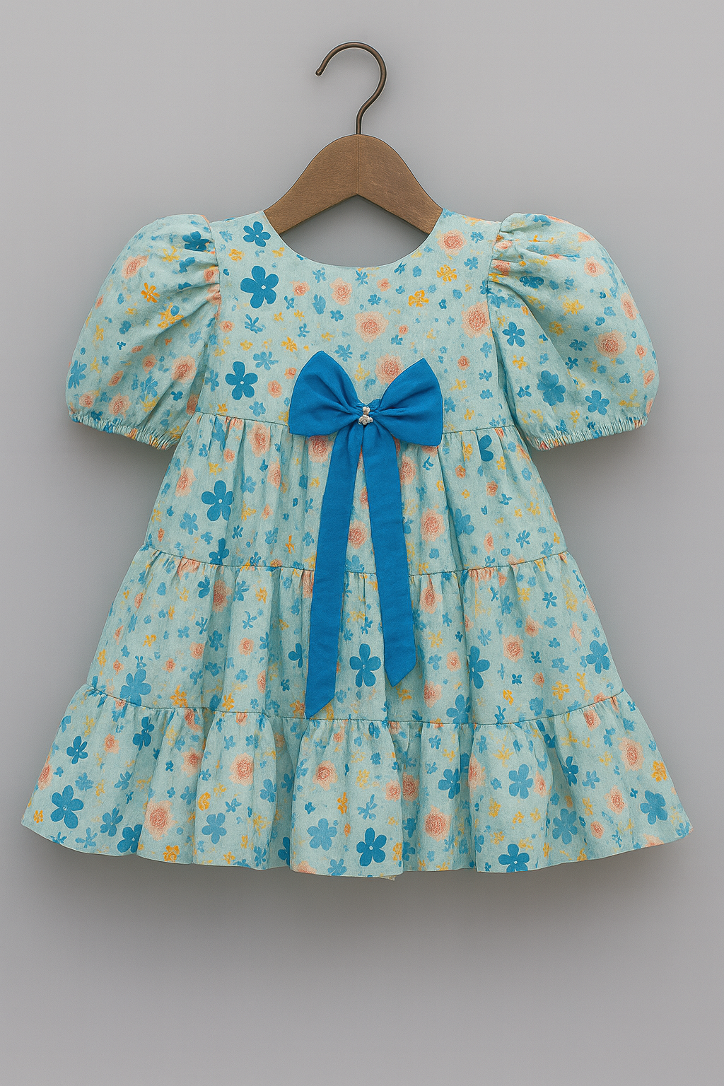 Crafted from soft breathable cotton, this tiered floral dress features puffed sleeves, a gently flared silhouette, and a statement bow with pearl detailing at the waist. Light and airy, it’s designed for sunny celebrations and picture-perfect memories.